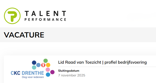 De Raad van Toezicht van CKC Drenthe is op zoek naar een nieuw lid met als aandachtsgebied 'bedrijfsvoering'. Ben jij verantwoordelijk voor de bedrijfsvoering binnen een innovatieve organisatie? Ben je samenwerkingsgericht, onafhankelijk en integer? Wil je vanuit je expertise een belangrijke bijdrage leveren aan de dialoog die binnen de Raad van Toezicht wordt gevoerd? Dan komen we via Talent Performance graag met je in contact.