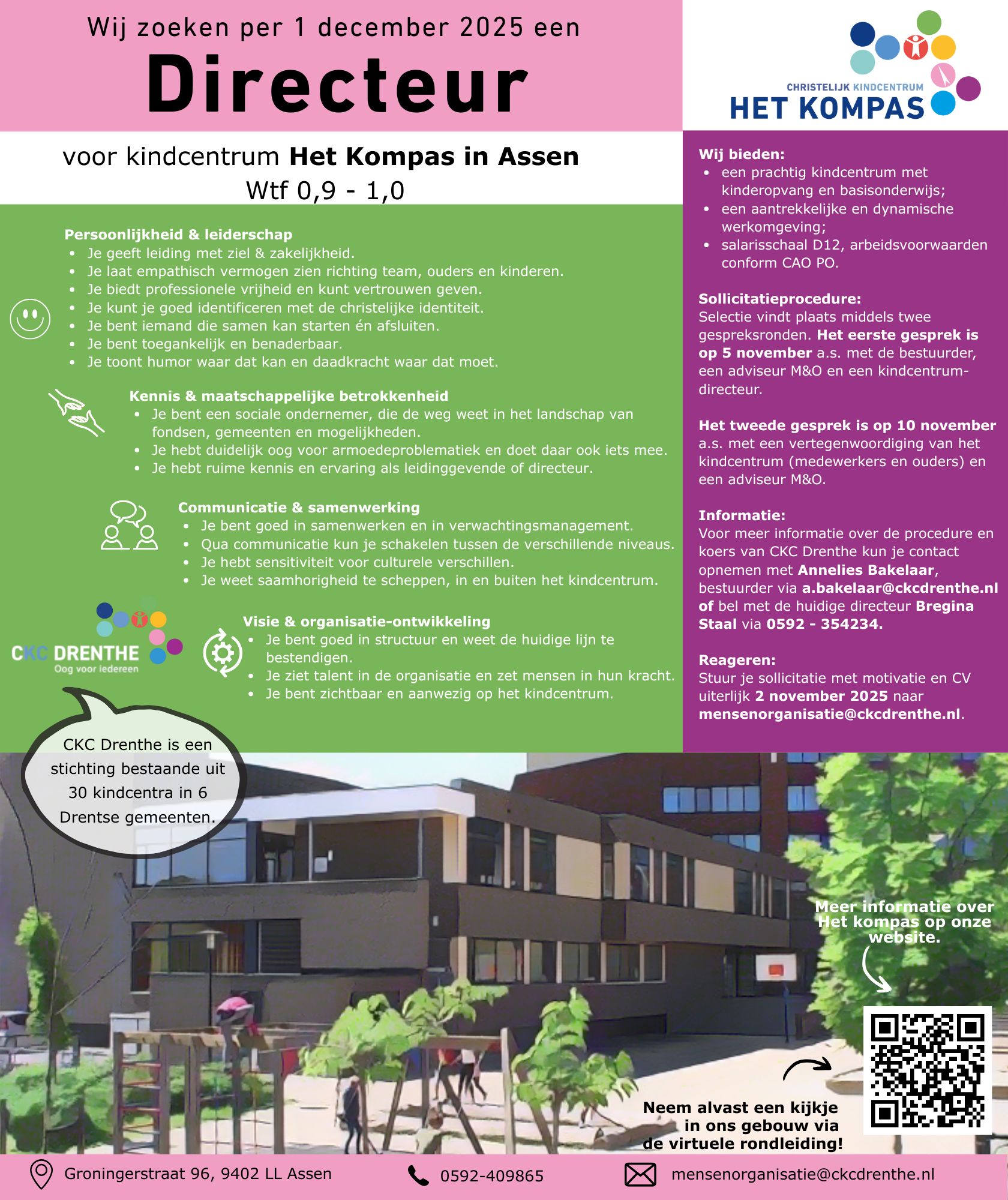 Wij zoeken per 1 december 2025 een directeur voor Kindcentrum Het Kompas in Assen (0,9 - 1,0 fte).